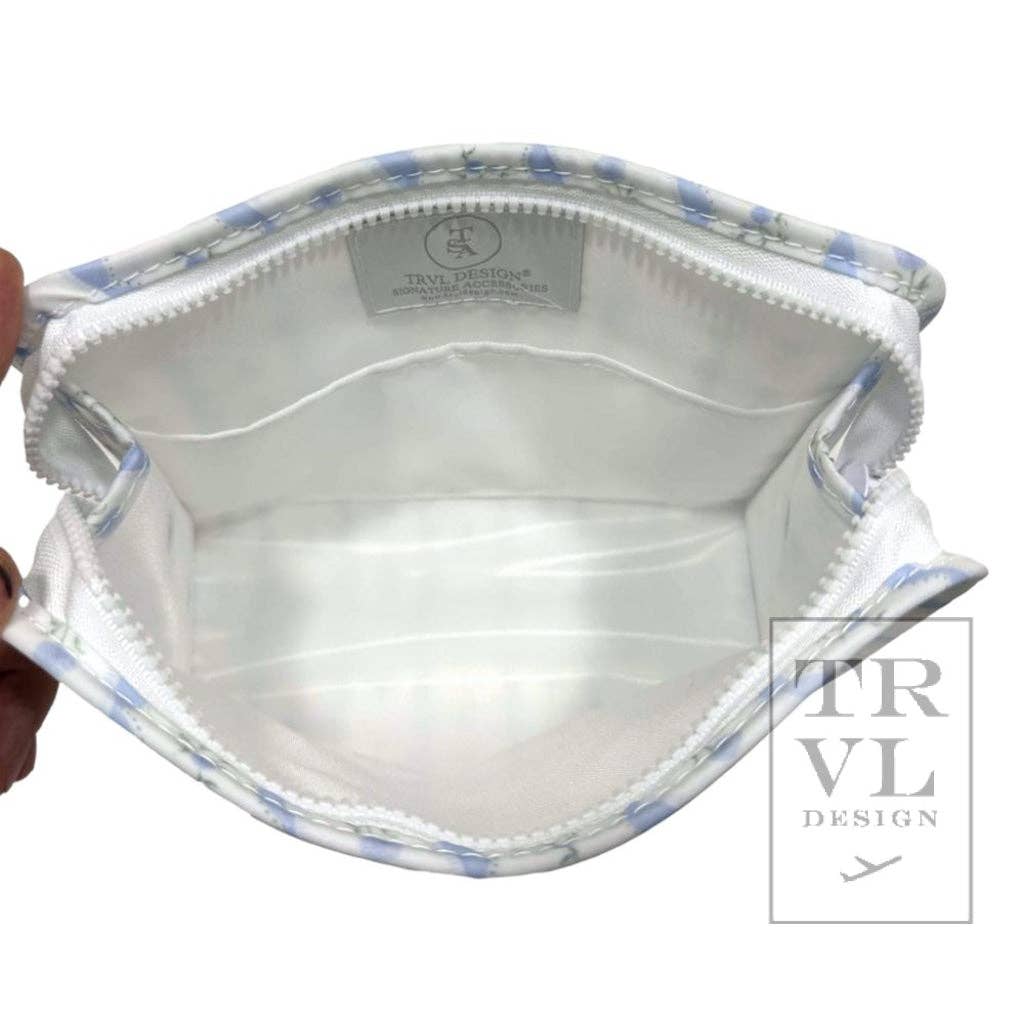Our best-selling Roadies are our BFFs in the pouch world! This print is our Large Roadie made with a thin Eco-friendly matte coating, an inside slip pocket and exterior snap open zip tabs for a wider opening and an easier access. * Size: 9"l x 7.25"h x 3"d * Coated Cotton * Lined in poly twill * Chunky White Zipper with snap closure * Water and stain resistant & wipeable inside and out * Care: wipe with a clean damp cloth * Made with our Signature* Environmentally Friendly PVC-free, non-chlorinate coating that is soft to the touch, waterproof, and biodegradable. This fabric has been specifically developed by TRVL as an environmentally friendly alternative for our TRVL Families!